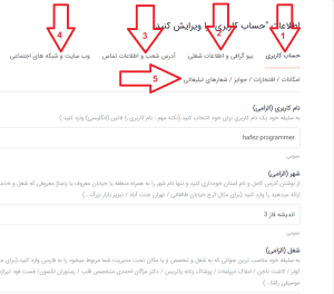 کاربر گرامی شما باید با کلیک روی تک تک تبهایی که با فلش قرمز رنگ مشخص شده تمامی اطلاعات داخل ان تبها را مطابق با سلیقه و نیاز خود تکمیل کنید و البته در صورتی که نیاز به پر کردن اطلاعات هر بخش هم نداشتید انرا خالی رها کنید و فراموش نکنید پس از تغییرات هر بخش با کلیک روی گزینه ذخیره تغییرات را اعمال کنید.پس از تکمیل اطلاعات شخصی و شغلی خود میتوانید در صورت نیاز عکس پروفایل خود را تغییر دهید و این عکس میتواند عکس شخصی شما و یا لوگوی از کسب و کار شما باشد. (در گوشیهای موبایل گزینه انتخاب عکس پروفایل برای ویرایش, داخل یک منوی کشویی قرار دارد که باید انتخاب شود)
